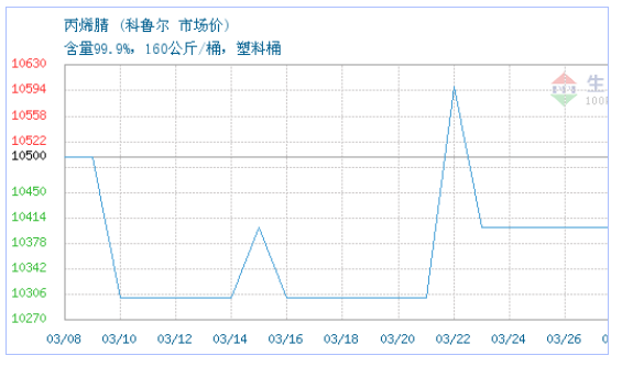03月30日科鲁尔关于丙烯腈的报价为10400元/吨。丙烯腈的规格:含量99.9%,160公斤/桶,塑料桶。该报价有效期为1天。报价提供方:扬州利宏日化科技有限公司。