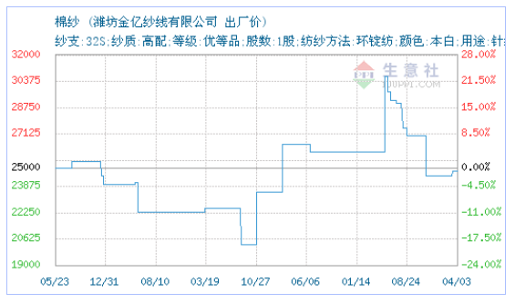 04月03日潍坊金亿纱线有限公司关于棉纱的报价为24800元/吨。棉纱的属性:纱支:32S;纱质:高配;等级:优等品;股数:1股;纺纱方法:环锭纺;颜色:本白;用途:针织。该报价有效期为3天。