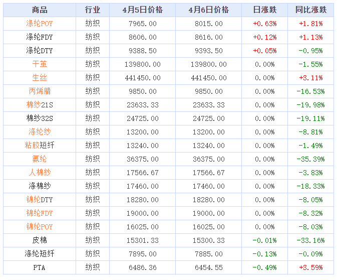 据生意社价格监测,2023年4月6日大宗商品价格涨跌榜中纺织版块环比上升的商品共3种,涨幅前3的商品分别为涤纶POY(0.63%)、涤纶FDY(0.12%)、涤纶DTY(0.05%)。环比下降的商品共3种,跌幅前3的商品分别为PTA(-0.49%),涤纶短纤(-0.13%),皮棉(-0.01%)。本日均涨跌幅为0.01%。