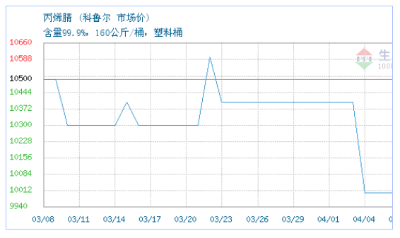 04月12日科鲁尔关于丙烯腈的报价为9900元/吨。丙烯腈的规格:含量99.9%,160公斤/桶,塑料桶。该报价有效期为1天。报价提供方:扬州利宏日化科技有限公司。