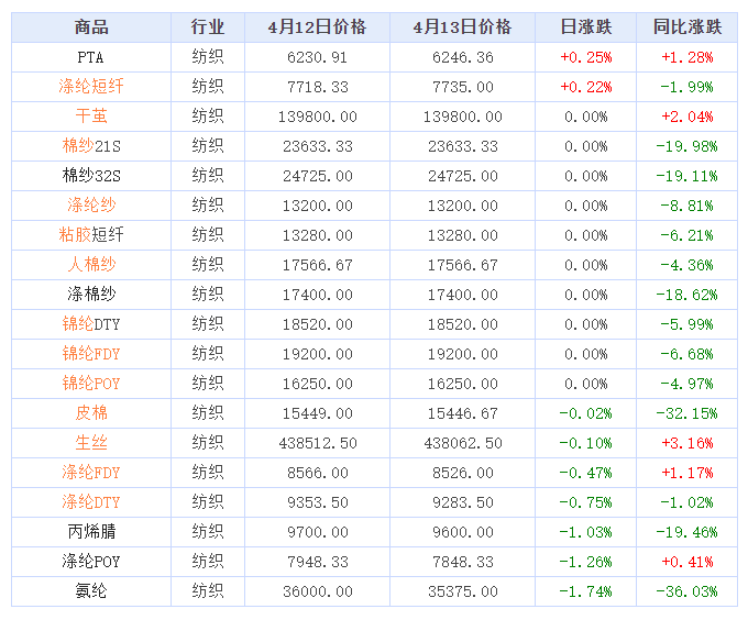 据生意社价格监测,2023年4月13日大宗商品价格涨跌榜中纺织版块环比上升的商品共2种,涨幅前2的商品分别为PTA(0.25%)、涤纶短纤(0.22%)。环比下降的商品共7种,跌幅前3的商品分别为氨纶(-1.74%),涤纶POY(-1.26%),丙烯腈(-1.03%)。本日均涨跌幅为-0.26%。