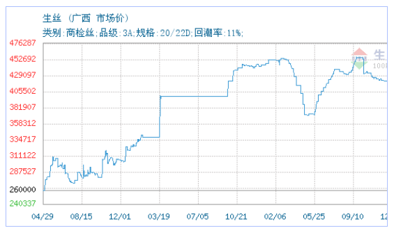 04月14日广西大宗茧丝交易市场关于生丝的报价为435625元/吨。生丝的规格:类别:商检丝;品级:3A;规格:20/22D;回潮率:11%;。该报价有效期为3天。报价提供方:广西大宗茧丝交易市场。