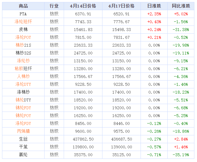 据生意社价格监测,2023年4月17日大宗商品价格涨跌榜中纺织版块环比上升的商品共4种,涨幅前3的商品分别为PTA(2.35%)、涤纶短纤(0.43%)、皮棉(0.24%)。环比下降的商品共5种,跌幅前3的商品分别为氨纶(-0.71%),干茧(-0.57%),生丝(-0.27%)。本日均涨跌幅为0.07%。