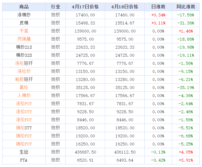 据生意社价格监测,2023年4月18日大宗商品价格涨跌榜中纺织版块环比上升的商品共2种,涨幅前2的商品分别为涤棉纱(0.34%)、皮棉(0.11%)。环比下降的商品共2种,跌幅前2的商品分别为PTA(-0.42%),生丝(-0.13%)。本日均涨跌幅为-0.01%。