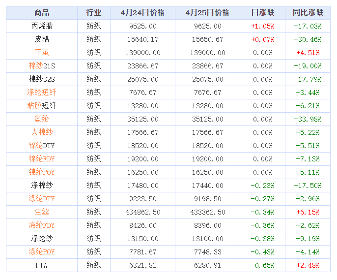 据生意社价格监测,2023年4月25日大宗商品价格涨跌榜中纺织版块环比上升的商品共2种,涨幅前2的商品分别为丙烯腈(1.05%)、皮棉(0.07%)。环比下降的商品共7种,跌幅前3的商品分别为PTA(-0.65%),涤纶POY(-0.43%),涤纶纱(-0.38%)。本日均涨跌幅为-0.08%。