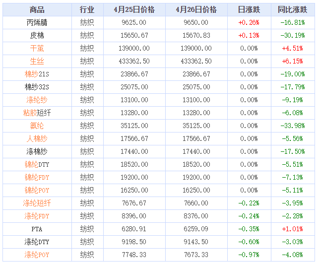 据生意社价格监测,2023年4月26日大宗商品价格涨跌榜中纺织版块环比上升的商品共2种,涨幅前2的商品分别为丙烯腈(0.26%)、皮棉(0.13%)。环比下降的商品共5种,跌幅前3的商品分别为涤纶POY(-0.97%),涤纶DTY(-0.60%),PTA(-0.35%)。本日均涨跌幅为-0.1%。