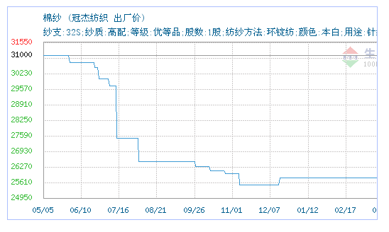 04月28日潍坊冠杰纺织有限公司关于棉纱32S的报价为25500元/吨。棉纱32S的规格:纱支:32S;纱质:高配;等级:优等品;股数:1股;纺纱方法:环锭纺;颜色:本白;用途:针织。该报价有效期为1天。报价提供方:潍坊冠杰纺织有限公司。