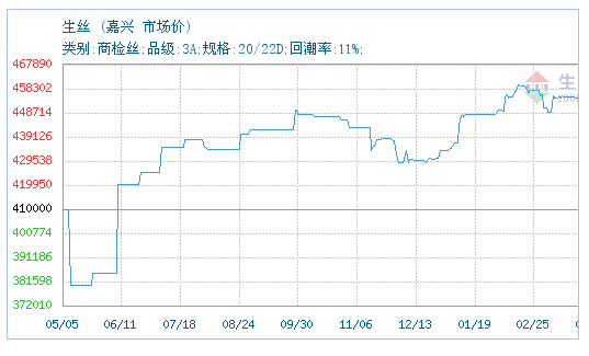 05月05日中国茧丝绸交易市场(嘉兴)关于生丝的报价为435000元/吨。生丝的规格:类别:商检丝;品级:3A;规格:20/22D;回潮率:11%;。该报价有效期为3天。报价提供方:中国茧丝绸交易市场(嘉兴)。