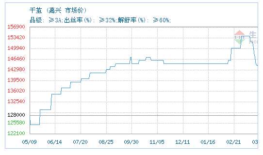 05月06日中国茧丝绸交易市场(嘉兴)关于干茧的报价为139100元/吨。干茧的规格:品级: ≥3A;出丝率(%): ≥32%;解舒率(%): ≥60%;。该报价有效期为3天。报价提供方:中国茧丝绸交易市场(嘉兴)。