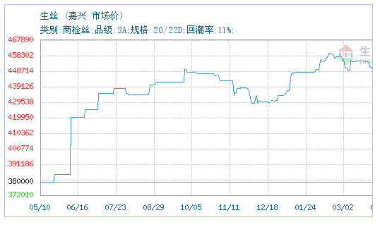 05月10日中国茧丝绸交易市场(嘉兴)关于生丝的报价为431700元/吨。生丝的规格:类别:商检丝;品级:3A;规格:20/22D;回潮率:11%;。该报价有效期为3天。报价提供方:中国茧丝绸交易市场(嘉兴)。