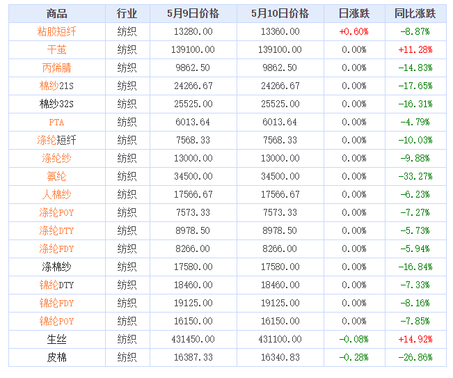 据生意社价格监测,2023年5月10日大宗商品价格涨跌榜中纺织版块环比上升的商品共1种,上涨的为粘胶短纤(0.60%)。环比下降的商品共2种,跌幅前2的商品分别为皮棉(-0.28%),生丝(-0.08%)。本日均涨跌幅为0.01%。