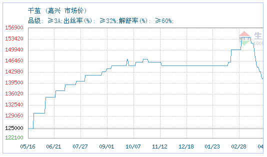 05月12日中国茧丝绸交易市场(嘉兴)关于干茧的报价为139100元/吨。干茧的规格:品级: ≥3A;出丝率(%): ≥32%;解舒率(%): ≥60%;。该报价有效期为3天。报价提供方:中国茧丝绸交易市场(嘉兴)。