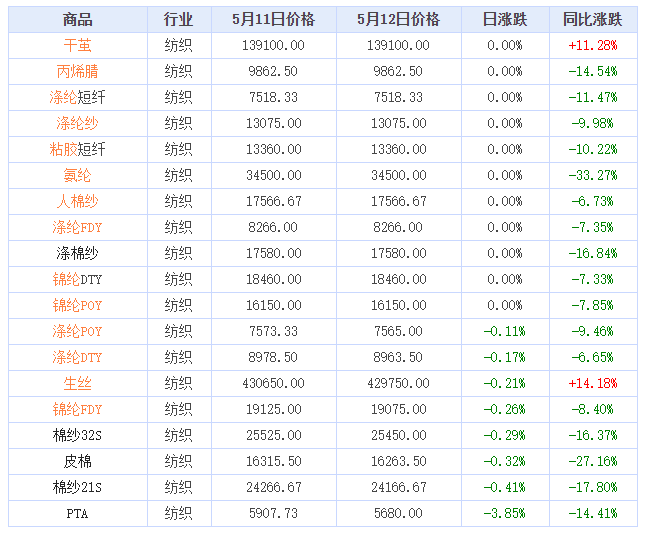 据生意社价格监测,2023年5月12日大宗商品价格涨跌榜中纺织版块环比上升的商品共0种。环比下降的商品共8种,跌幅前3的商品分别为PTA(-3.85%),棉纱21S(-0.41%),皮棉(-0.32%)。本日均涨跌幅为-0.3%。