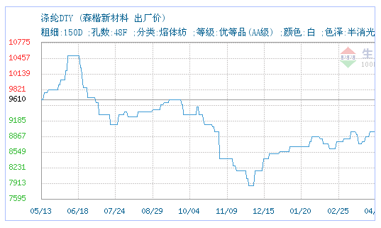 05月12日森楷新材料关于涤纶DTY的报价为8810元/吨。涤纶DTY的规格:粗细:150D ;孔数:48F ;分类:熔体纺 ;等级:优等品(AA级) ;颜色:白 ;色泽:半消光 ;工艺:低弹 ;。该报价有效期为3天。报价提供方:浙江森楷新材料有限公司。