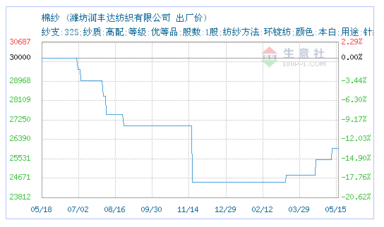 05月15日潍坊润丰达纺织有限公司关于棉纱的报价为26000元/吨。棉纱的属性:纱支:32S;纱质:高配;等级:优等品;股数:1股;纺纱方法:环锭纺;颜色:本白;用途:针织。该报价有效期为3天。