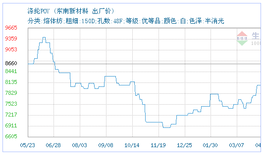 05月19日东南新材料关于涤纶POY的报价为7410元/吨。涤纶POY的规格:分类:熔体纺;粗细:150D;孔数:48F;等级:优等品;颜色:白;色泽:半消光。该报价有效期为3天。报价提供方:杭州东南新材料销售有限公司。