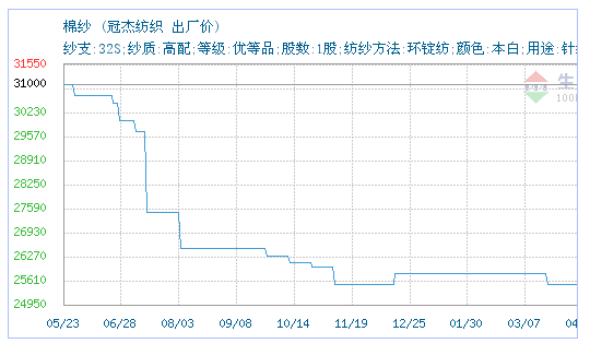 05月19日潍坊冠杰纺织有限公司关于棉纱32S的报价为25700元/吨。棉纱32S的规格:纱支:32S;纱质:高配;等级:优等品;股数:1股;纺纱方法:环锭纺;颜色:本白;用途:针织。该报价有效期为1天。报价提供方:潍坊冠杰纺织有限公司。
