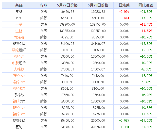 据生意社价格监测,2023年5月23日大宗商品价格涨跌榜中纺织版块环比上升的商品共2种,涨幅前2的商品分别为皮棉(0.99%)、PTA(0.64%)。环比下降的商品共2种,跌幅前2的商品分别为氨纶(-1.48%),棉纱32S(-0.98%)。本日均涨跌幅为-0.04%。