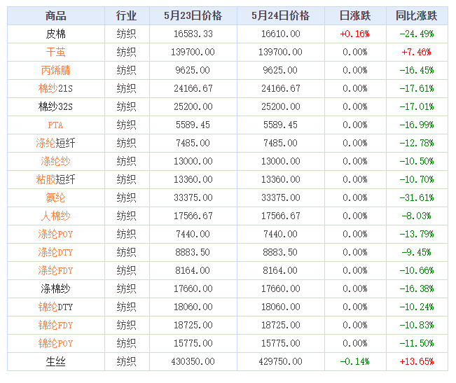 据生意社价格监测,2023年5月24日大宗商品价格涨跌榜中纺织版块环比上升的商品共1种,上涨的为皮棉(0.16%)。环比下降的商品共1种,跌幅的商品是生丝(-0.14%)。本日均涨跌幅为0%。