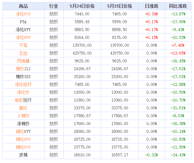 据生意社价格监测,2023年5月25日大宗商品价格涨跌榜中纺织版块环比上升的商品共4种,涨幅前3的商品分别为涤纶POY(0.34%)、PTA(0.17%)、涤纶DTY(0.17%)。环比下降的商品共1种,跌幅的商品是皮棉(-0.32%)。本日均涨跌幅为0.03%。