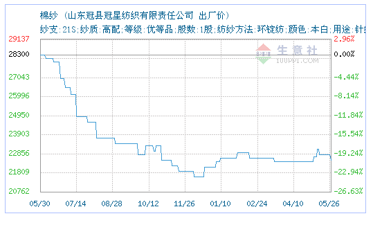 05月26日山东冠县冠星纺织有限责任公司关于棉纱的报价为22500元/吨。棉纱的属性:纱支:21S;纱质:高配;等级:优等品;股数:1股;纺纱方法:环锭纺;颜色:本白;用途:针织。该报价有效期为3天。