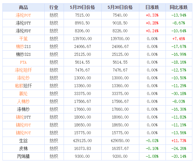 据生意社价格监测,2023年5月30日大宗商品价格涨跌榜中纺织版块环比上升的商品共3种,涨幅前3的商品分别为涤纶POY(0.33%)、涤纶DTY(0.28%)、涤纶FDY(0.24%)。环比下降的商品共3种,跌幅前3的商品分别为丙烯腈(-1.08%),皮棉(-0.10%),生丝(-0.02%)。本日均涨跌幅为-0.02%。