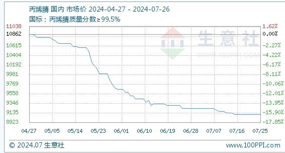 7月26日,生意社丙烯腈基准价为9100.00元/吨,与本月初(9233.33元/吨)相比,下降了-1.44%。