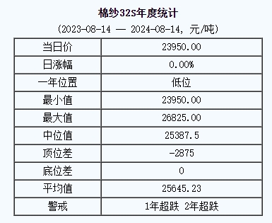 8月14日,生意社棉纱32S基准价为23950.00元/吨,与本月初(24450.00元/吨)相比,下降了-2.04%。