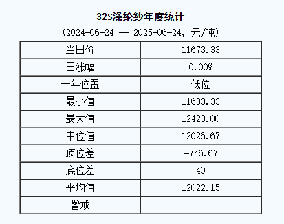 6月24日,生意社32S涤纶纱基准价为11673.33元/吨,与本月初(11633.33元/吨)相比,上涨了0.34%。