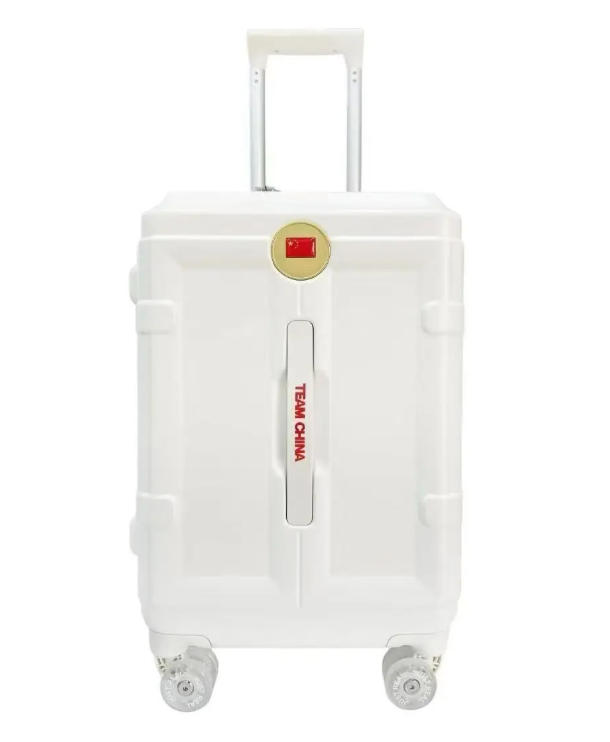 在艺尚小镇的臻元品牌门店内,记者见到了这款专属行李箱。箱体以白色为主调、红色点缀其间,正面圆形金色底座镶嵌国旗图案,搭配雪花纹路,将东方匠韵与赛事氛围巧妙融合,既彰显为国争光的担当,又极具辨识度。