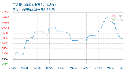 7月16日生意社丙烯腈基准价与本月初(8016.67元/吨)相比,下降了1.46%