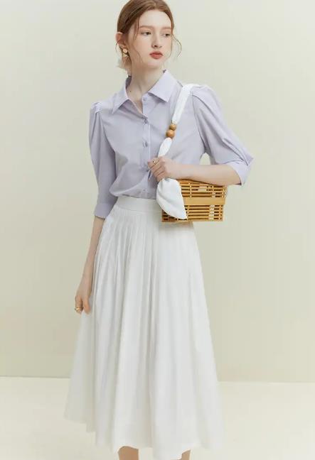 这种色调尤其适合傍晚的户外活动,当夕阳的金光落在浅紫色衬衫上,会折射出温柔的冷调光泽,消解了落日余晖的燥热。